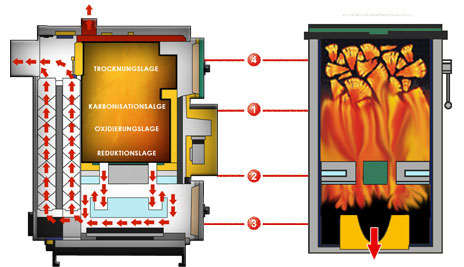 Trocknung und Vergasung des Holzes bei 450° Grad Celsius.